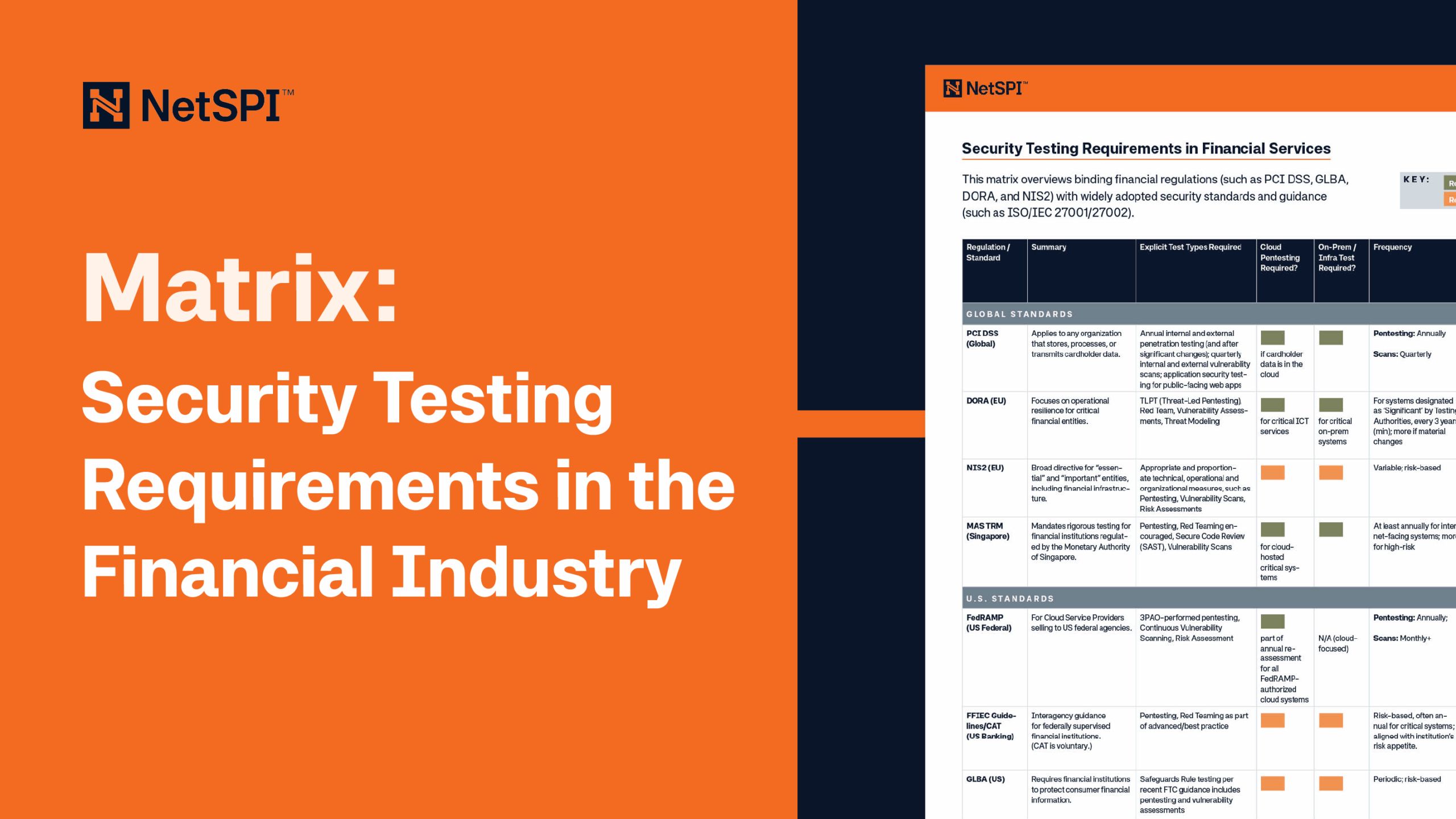 This comprehensive matrix breaks down financial industry security testing regulations (such as PCI DSS, GLBA, DORA, NIS2, and ISO/IEC 27001/27002)